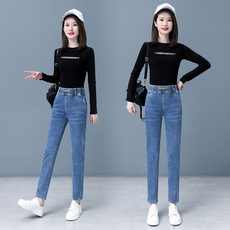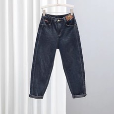 2025秋冬加厚牛仔裤女宽松显瘦小脚萝卜裤潮半松紧百搭弹力哈伦裤
