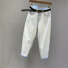 水洗磨白浅蓝色牛仔裤女欧货夏薄款宽松小脚哈伦裤2024新款九分裤