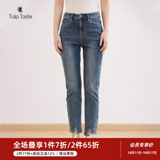 拉夏贝尔小脚牛仔裤女2025年秋季新款高腰修身显瘦毛边九分铅笔裤