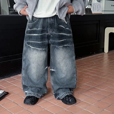 儿童个性磨白加绒加厚直筒牛仔裤潮2025冬季男中大童宽松休闲长裤