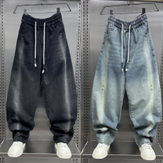 秋冬潮牌加绒加厚牛仔裤男士宽松直筒水洗渐变色抽绳痞帅哈伦裤男