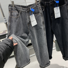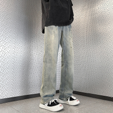 美式复古100%棉水洗做旧烟灰色宽松直筒休闲牛仔裤男 阔腿长裤潮