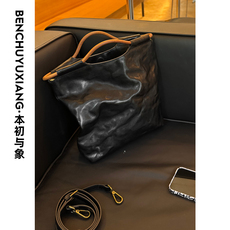 本初与象定制新款头层牛皮植鞣皮单肩斜挎手提女包拼色大包大容量