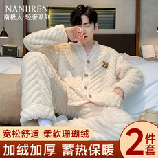 秋冬季加厚珊瑚绒睡衣男加绒套装可外穿法兰绒新款家居服大码可爱