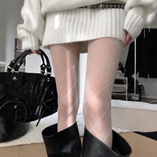黑丝袜菱形格闪亮银丝连裤袜女春夏季薄款透肉性感显瘦珠光打底袜