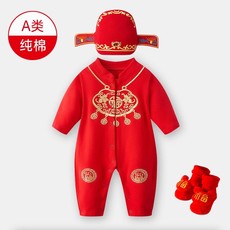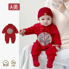 中国风周岁礼服男女宝宝红色百天连体衣春秋婴儿抓周唐装满月哈衣