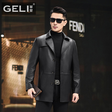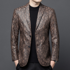 2025新款秋冬真皮皮衣男士西装领修身豹纹牛皮印花商务绅士皮外套