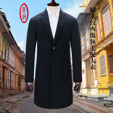 鼎铜毛呢大衣男中长款中年男士商务休闲修身暗条纹西服领羊毛外套