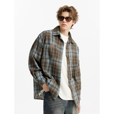 春秋季美式复古潮牌街头晕染磨毛格子长袖衬衫男女四合扣上衣