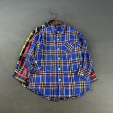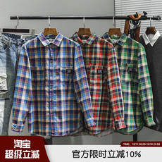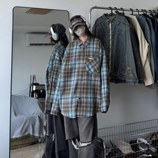 春秋季美式复古潮牌街头晕染磨毛格子破洞长袖衬衫男女四合扣寸衫