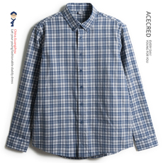 清新文艺范!2021年春季新款日系复古男士磨毛格子长袖衬衫衬衣潮