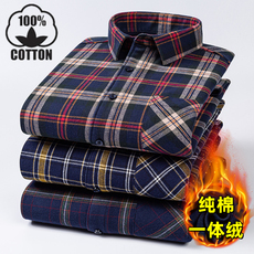 保罗100%纯棉加绒保暖衬衫男加厚全棉磨毛格子爸爸装带绒衬衣大码