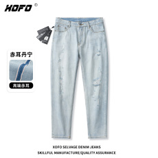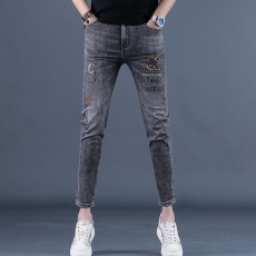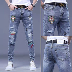 2025春夏款刺绣牛仔裤男潮牌破洞时尚修身小脚弹力薄款高端裤子男