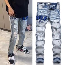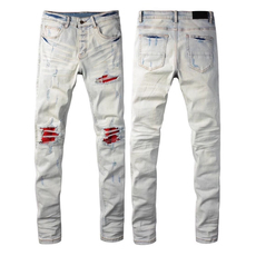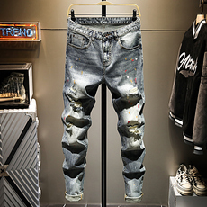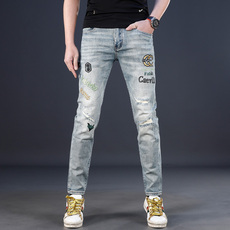 欧美高街潮牌新款浅色补丁破洞牛仔裤男士修身小脚痞帅休闲长裤子