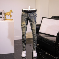 春季潮牌美式风蓝色牛仔裤男时尚拼接复古机车长裤修身小脚裤子潮