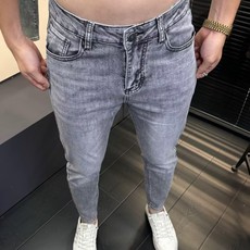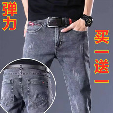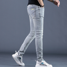 香港潮牌春季灰色牛仔裤男超高弹力修身小脚裤时尚休闲青年长裤子
