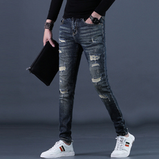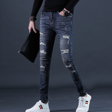 男士破洞补丁牛仔裤男新款潮牌复古修身小脚弹力休闲百搭长裤子