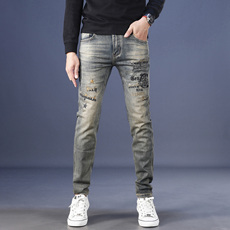 欧洲站男士潮牌牛仔裤秋季新款破洞刺绣休闲百搭弹力修身小脚裤子