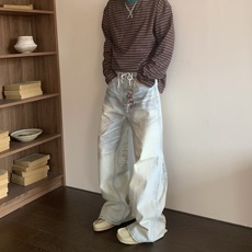 HY711 奶油擦脏直筒baggy牛仔裤男女美式复古宽松阔腿休闲裤子