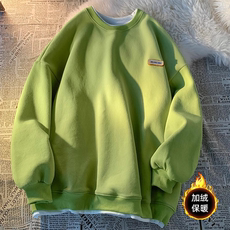 假两件圆领无帽卫衣男牛油果绿色加绒加厚上衣oversize长袖T恤冬