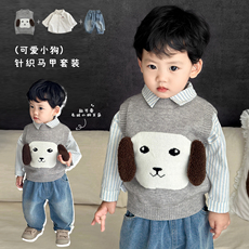 男童春秋款卡通针织马甲套装男宝宝翻领条纹衬衫婴幼儿宽松牛仔裤