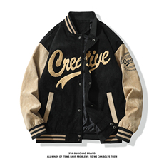 STA潮牌毛巾绣棒球服男士秋冬新款韩版麂皮夹克外套情侣装上衣