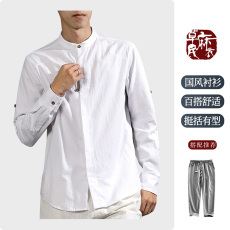 极麻国潮立领盘扣长袖亚麻衬衫男中国风休闲百搭薄款宽松棉麻衬衣