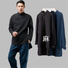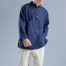 中国风夏秋薄款亚麻布斜襟立领盘扣男式改良汉服唐装长袖上衣衬衫