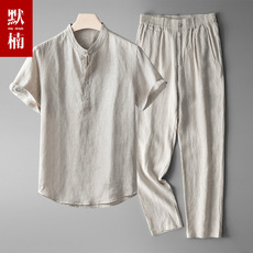 纯亚麻短袖T恤男士套装立领棉麻复古透气休闲宽松半袖衬衣两件套