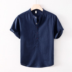 极麻中国风立领盘扣短袖亚麻衬衫男清新文艺宽松百搭休闲棉麻衬衣