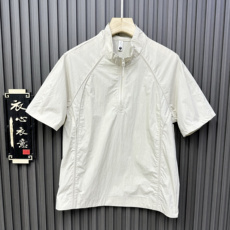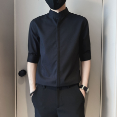 2025夏季新款男士短袖衬衫潮流时尚半拉链立领修身纯色休闲半截袖