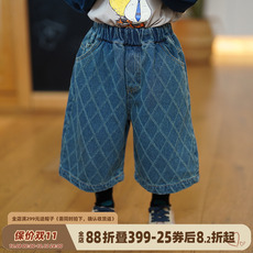 砚台家童装儿童蓝色牛仔裤秋装帅气童服男童格子七分裤男宝直筒裤