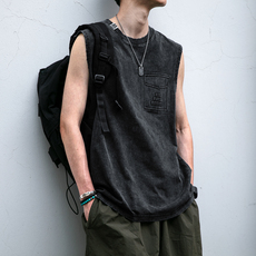 美式复古炒雪花重磅水洗背心男夏季防口袋钢印磨破纯棉无袖T恤潮