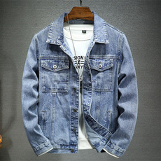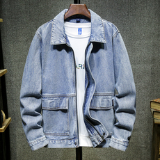 欧美复古浅色牛仔外套男修身大码拉链大口袋夹克潮流上衣男装褂子