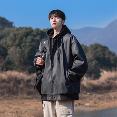 皮衣男秋冬男士潮流宽松薄绒帅气皮西服软皮西装领外套中长皮夹克