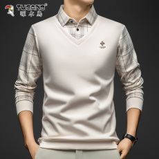 啄木鸟男士休闲翻领假两件T恤衫秋冬时尚长袖加绒加厚纯棉打底衫