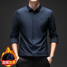 加绒加厚时尚无痕衬衫男士秋冬季弹力保暖条纹长袖休闲衬衣修身