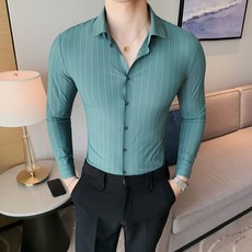 亚麻衬衫男长袖夏季条纹商务休闲透气修身上衣绅士免烫尖扣领衬衣