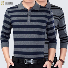 啄木鸟男士翻领t恤长袖秋季中年条纹宽松打底polo衫休闲百搭上衣