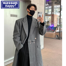 wassup happy双排扣毛呢大衣男秋冬季潮流中长款宽松呢子风衣外套