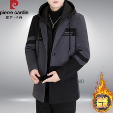 皮尔卡丹毛呢子大衣中长款秋冬季加绒加厚保暖风衣可脱卸帽外套男
