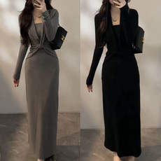 法式气质扭结假两件V领长袖连衣裙女秋冬性感修身显瘦包臀长裙潮