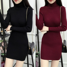 秋冬新款半高领保暖修身显瘦纯色纯棉过膝长款打底长袖连衣裙女装
