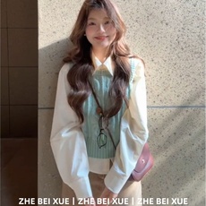 套装女小清新针织绿色显白马甲长袖衬衫半身裙巨好看的早秋一整套