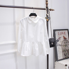秋装新款娃娃领纯色长袖衬衫女百搭简约纯棉白色打底小清新衬衣