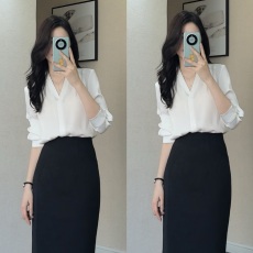 体制内的魅力|梨花白V领长袖丝缎衬衫半裙通勤职业女套装极简气质