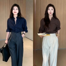 套装女简约风立领白色长袖衬衫高腰宽松休闲裤巨好看的早秋一整套