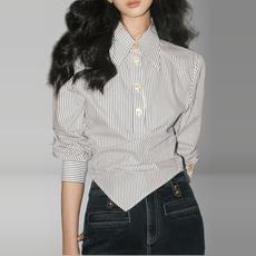 复古百搭老钱风白衬衣女通勤不规则纯色上衣下摆斜裁长袖条纹衬衫