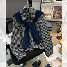 撞色黑白格纹子长袖衬衫外套加披肩女2025早秋新款今年流行的上衣