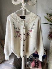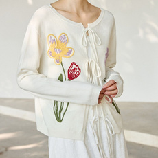 复古毛衣白色刺绣花毛衣开衫外套女初秋穿搭长袖针织上衣羊毛开衫